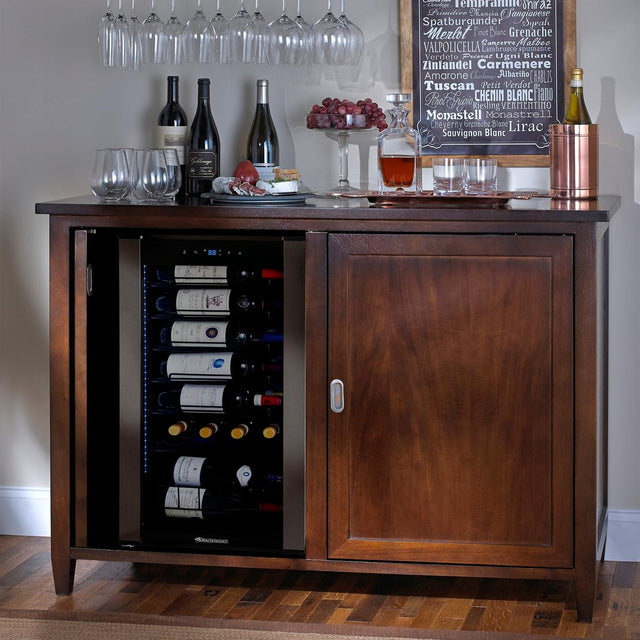 Behind the pocket doors hides the perfect space to store your wine and spirits out of sight but within easy reach. Each of the two interior compartments can be used to house a 28-bottle wine refrigerator. The left side compartment includes two sliding, removable shelves. Espresso finish.