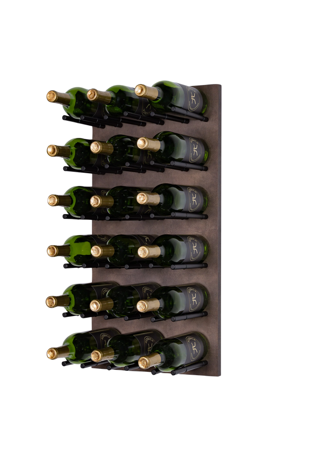 Wine As Art wine hardware is utilized on a wall-mounted decorative panel to display and store wine in an efficient and aesthetic format. From single panel wine storage to multi-panel showcase wine-wall displays, Wine As Art can transform any space. Wine bottles are colorful and interesting and can be utilized as a design element to create an aesthetic and entertaining wine storage space. The Wine As Art panel system incorporates a back wall plate, decorative top panel, and the Wine As Art wine hardware to produce a structurally sound and visually stunning way to store and display wine.